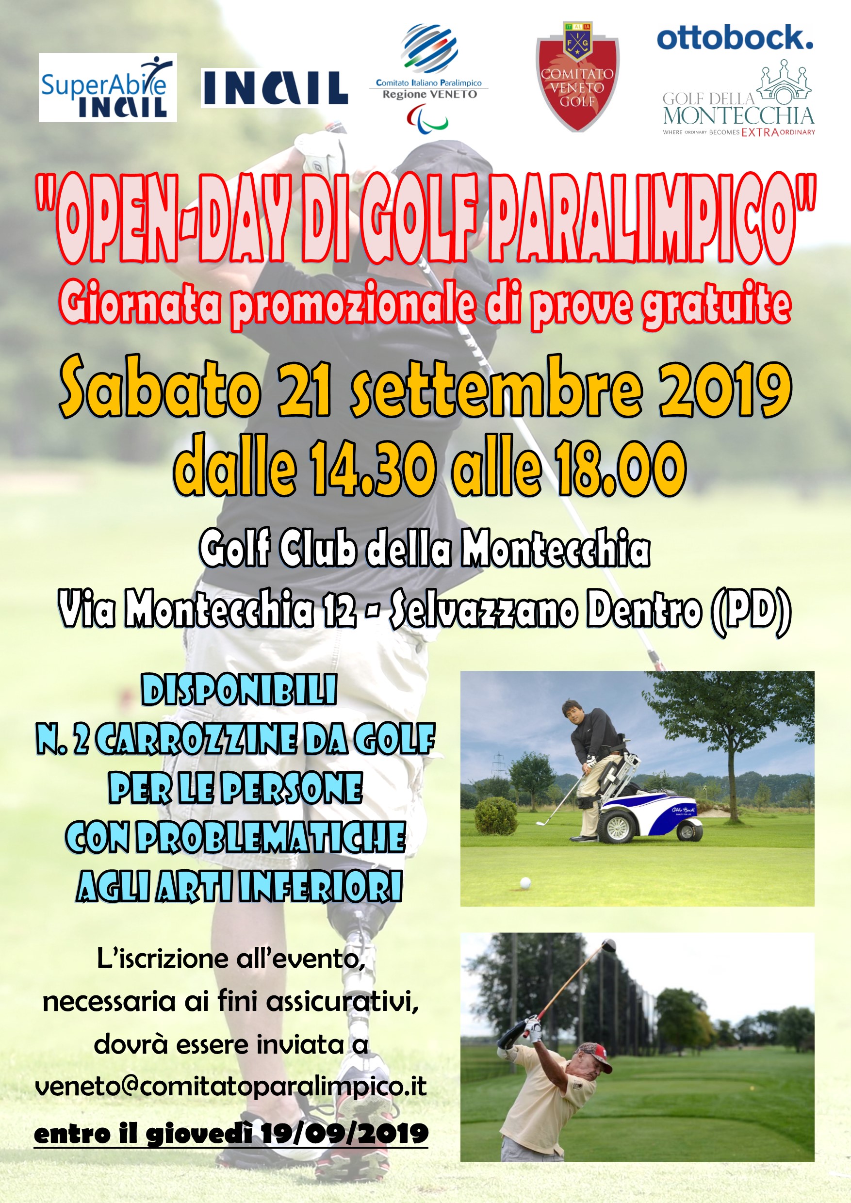 Si terrà sabato 21 settembre 2019 presso il Golf Club della Montecchia in Via Montecchia 12 - Sevazzano Dentro (PD) l'"OPEN-DAY DI GOLF PARALIMPICO" Giornata promozionale di prove gratuite. Il Golf Clup metterà adisposizione 2 carrozzine da Golf per le persone con problematiche agli arti inferiori. L'iscrizione all'evento necessaria ai fini organizzativi, dovrà essere inviata a Questo indirizzo email è protetto dagli spambots. È necessario abilitare JavaScript per vederlo. entro giovedì 19/09/2019. Per iscrizione scarica i file dal link sottostante: