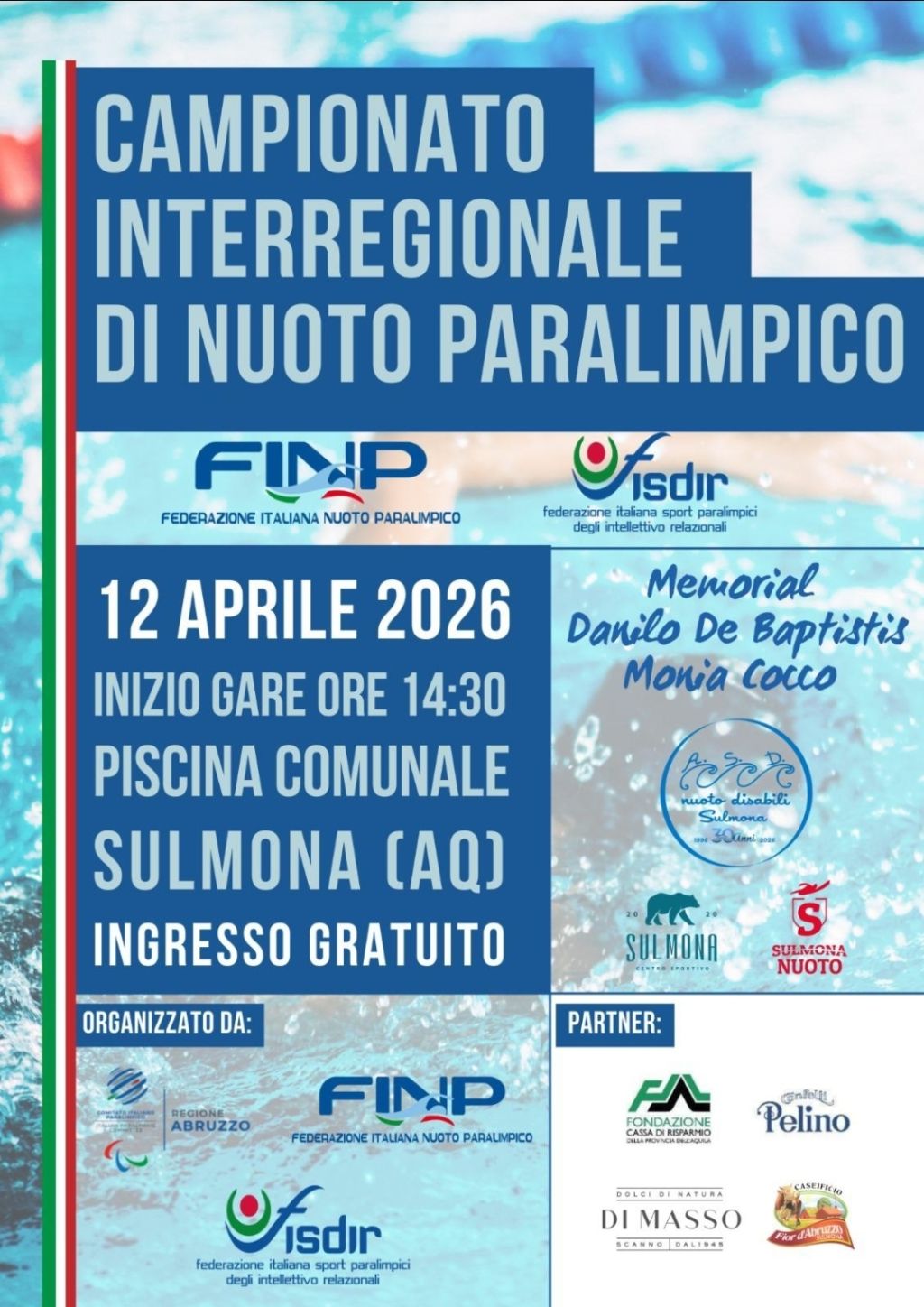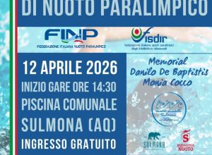 E' in programma domenica 12 Aprile dalle ore 14:00 nella piscina comunale di Sulmona il Campionato Interregionale di Nuoto Paralimpico organizzato in memoria degli atleti sulmonesi "Cocco Monia e De Baptistis Danilo".