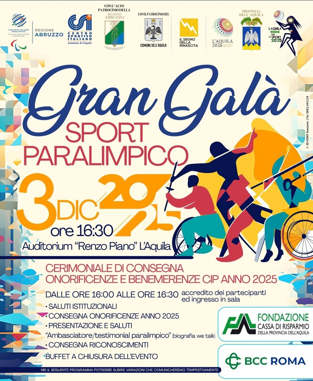 Il Comitato Regionale CIP Abruzzo ringrazia Regione Abruzzo, Provincia dell’Aquila, Comune dell’Aquila, BCC Roma, Fondazione Carispaq e L’Aquila Insieme per lo Sport per i patrocini e il sostegno all’iniziativa.