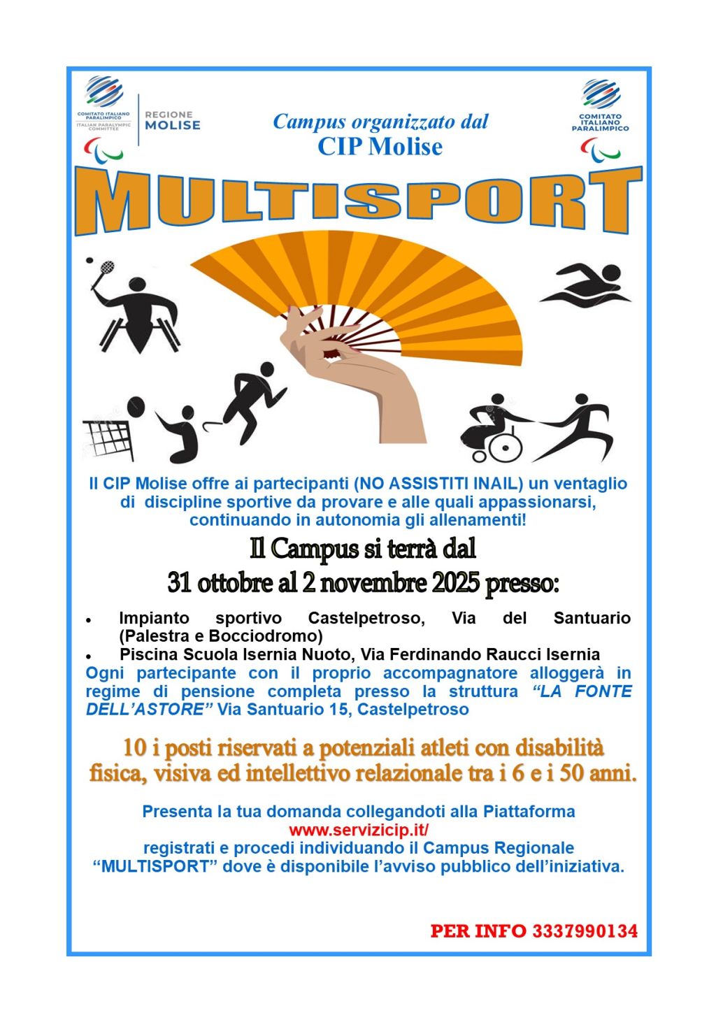 Dal 31 ottobre al 02 novembre 2025 il CIP Molise sarà alle prese con una nuova avventura paralimpica: MULTISPORT il Campus regionale residenziale che ti permetterà di sperimentare un ampio ventaglio di attivirà sportive.
